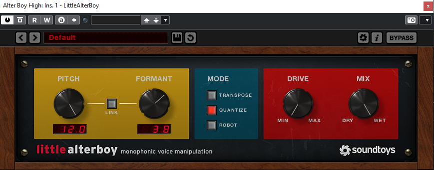 In addition to the chain I mentioned above, to thicken and enhance the vocals I used what is lately one of my favorite plugins ( and probably my “secret weapon” for making awesome lo-fi vocals, at least on this track! ) Soundtoys Little Alterboy, I actually used two of these parallel the original vocal track, running one an octave up, with the format adjusted so to avoid the’ “Alvin and the Chipmunks effect” and one, running with the format rolled back, to just sure things up a bit in the low-mids, while introducing a different timbre in the vocals. The octave up “Alterboy” really works well with my voice, so much so, that to my ears, it sounds like a female voice, really helping to give the vocals more depth and substance in an organic and musical way. The last thing the vocals got on the main channel was again, two plugins from Soundtoys, “Little Plate” for reverb and “Echoboy” for both a bit of saturation and delay.